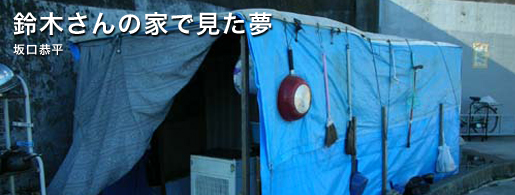 そんなある日である。僕は路上生活者たちの家のフィールドワークをしていた。そこで一軒の家と出会う。隅田川沿いに建つその家には鈴木さんという60歳の男性が住んでいた。部屋に入り、お酒を飲みながら話をきかせてもらうことにした。横ではラジカセから拾ってきた演歌の音楽が鳴り響いている。それは日常的にテレビ番組などで聞く演歌とは明らかに違うまるで異国の音楽のような気がした。ほろ酔いになりながらゴロンと横になり、鈴木さんの家を体感しているうちに、ふとあの夢の空間のことが思い出されたのである。
