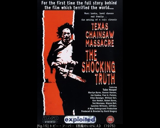 そういう状況に知覚を置くのではなくて、どこまでも鮮やかに見えたり聴こえたりするところに、倫理の最低限の基盤を考えたいという気持ちがつねにあります。そういう意味では、いくつかのホラー映画にはたしかに無数の覚醒の契機がある。私はまだ映画を何も知らなかった若い頃に、トビー・フーパーの《悪魔のいけにえ》(1975)[fig.15]を観て、ショックで一日言葉が喋れなくなってしまったことがあるのですが(笑)、レザーフェイスが扉を開ける速度とか、朝日のなかでチェーンソーを振り回すときの始まりと終わりが一挙に到来してしまったような感覚とかが、ものすごく解像度の高い経験としていまだに身体のなかに残っている。ショックということのなかにもいろいろなものがあるはずだし、それをあくまで具体的な映像や音の現われのなかから考えていきたいと思っています。